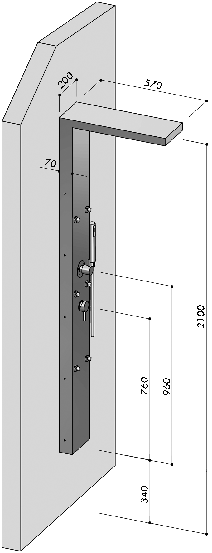 Panel de ducha mural, con monomando, inversor 5 vías, 6 duchas laterales orientables, rociador integrado 220 x 110 mm y teleducha