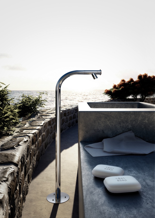 Fijación al suelo por medio de varillas, tuercas, tapas y arandelas, todo en acero inox Aisi 316